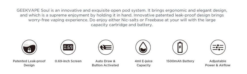 Geekvape Soul Kit 1500mAh 4ml is an innovative and exquisite open pod system. It brings ergonomic and elegant design, and which is a supreme enjoyment by holding it in hand. Innovative patented leak- proof design brings worry-free vaping experience. Do enjoy Freebase at your will with the large capacity cartridge and battery.