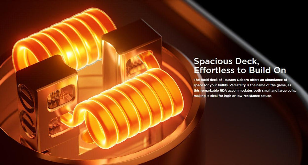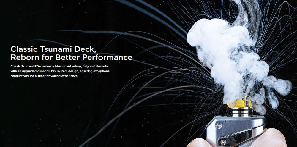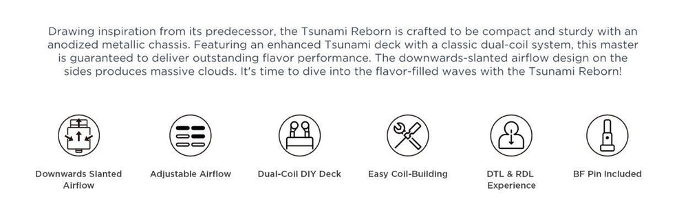 Tsunami Reborn Z RDA features enhanced Tsunami deck with upgraded dual-coil DIY system to bring you superior vaping experience. The Dual-Coil DIY deck can accommodate both large and small coils, making Tsunami Reborn Z a versatile RDA among the average ones. Designed with downward-slanted airflow, it can produce massive clouds. The full-metal body makes Tsunami Reborn Z more durable.