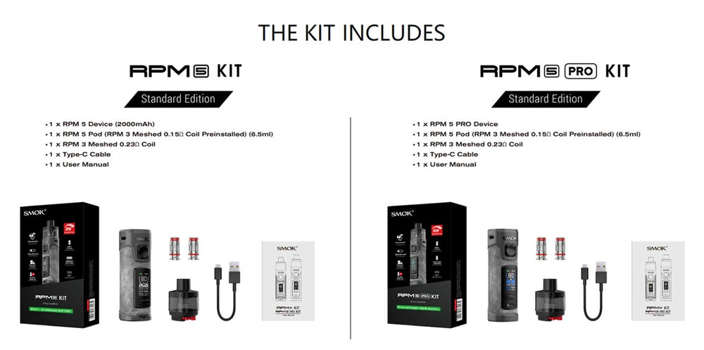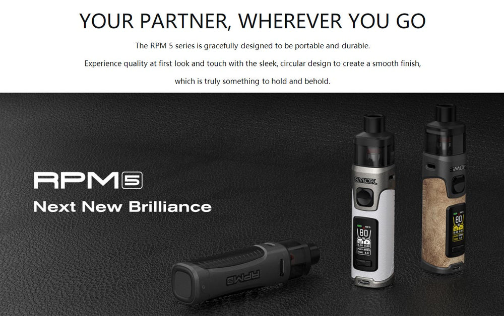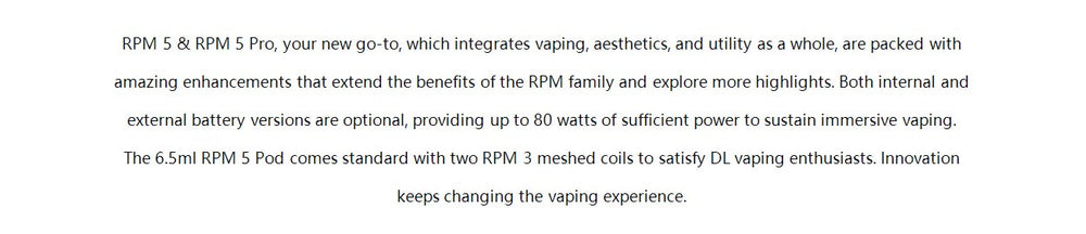 Smok RPM 5 Pod Mod Kit, by a 2000mAh integrated battery. Both internal and external battery versions are optional, providing up to 80 watts of sufficient power to sustain an immersive vaping. The new mesh technology is adopted to enhance the flavor more efficiently, and due to the enlarged meshed surface more clouds are generated, which not only increases the atomization area but also improves the heating rate. The distinctive feature is its slide-to-open top fill and child-resistant pod design, which further prevent leakage. The stepless airflow control is adjustable, whichever you choose is complementary down to your preference. The 6.5ml RPM 5 Pod comes standard with two RPM 3 meshed coils to satisfy DL vaping enthusiasts. The glossy finish and rounded edges offer a stylish look and flowing feel, while the stunning pod combines classic design with ingenuity to bring you a full-featured vaping companion.