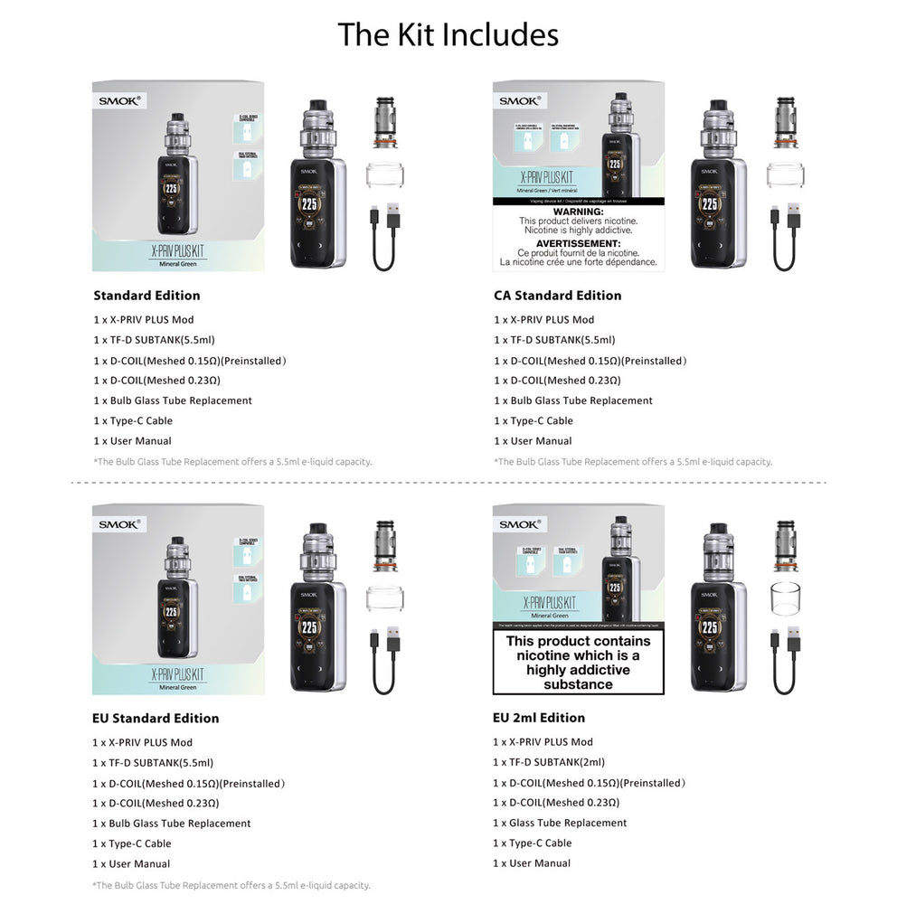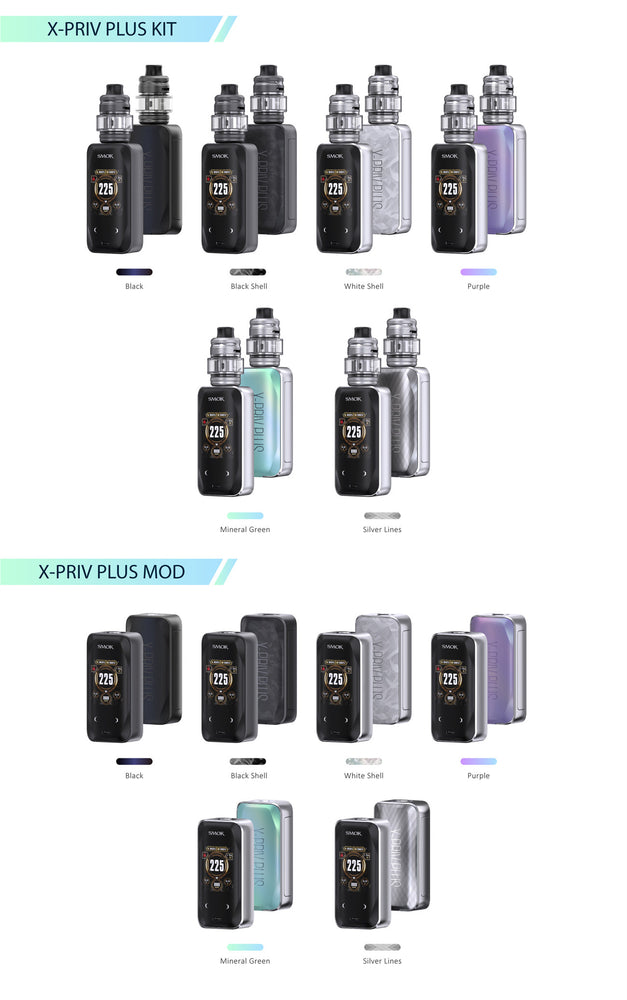 SMOK X-PRIV Plus Mod Kit Great capabilities bring unparalleled performance, featuring a maximum output of 225W,2.0A fast charging, and dual externally dual 18650 batteries.These attributes are intrinsic to the X-PRIV PLUS, demonstrating its remarkable power. Coupled with the TF-D SUBTANK, which is compatible with the D-COIL Series and crafted to elevate DTL (direct-to-lung) vaping experiences. Innovation keeps changing the vaping experience.