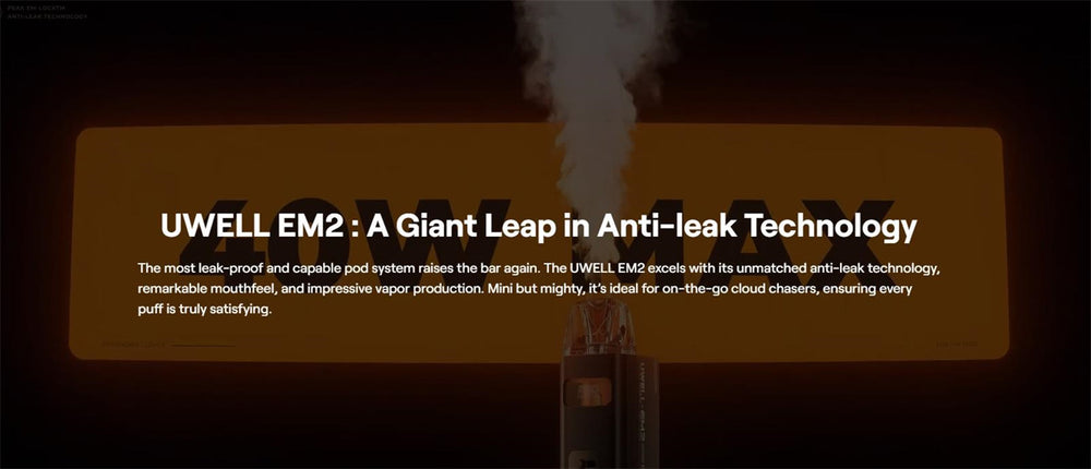 Introducing the UWELL EM2 Pod System, an industry technological innovation. With its upgraded EM-LOC technology and unparalleled anti-leak performance,it becomes UWELL's most leak-proof pod system. Designed specifically for RDL users, it outshinesits competitors with it sall-new 4.5ml-0.3ohm, 40W max power. The EM2 excels in every detail, from its polished metal finish to its remarkable mouthfeel and impressive vapor production—all packed into a palm-sized device. Perfect for on-the-go cloud chasers, the UWELL EM2 ensures every puff is satisfying.