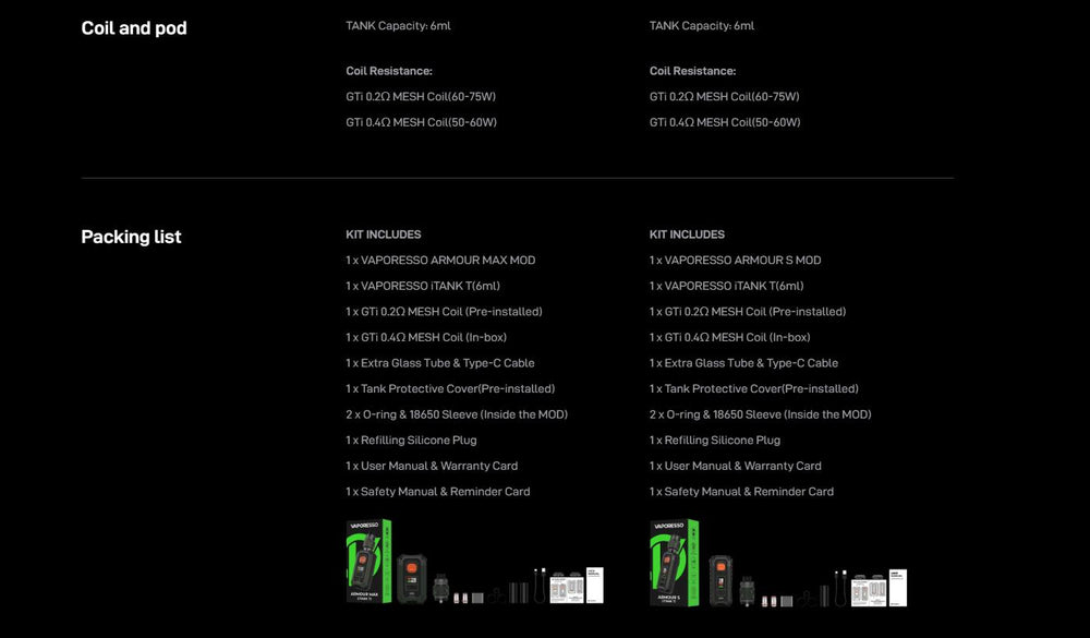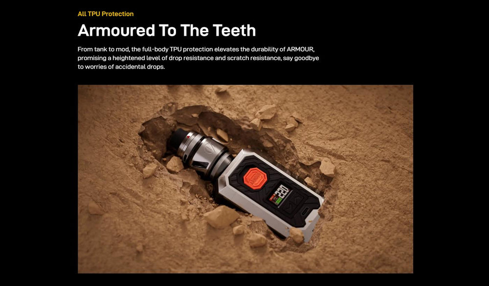 Vaporesso Armour Max and Armour S are the new dual/single 21700 box kit for advanced DTL vapers. Crafted entirely from TPU material, Armour envelops your tank and mod, ensuring comprehensive defense. And it's not just about protection, it's about sm art engineering like the uni-lock that sim plify your experience and elevate your vaping journey. With the innovative iTank T and GTi coils, it provides more accurate flavor and 50% longer lifespan.The iTank T features a top airflow and top-fill system, making it easy to use while significantly reducing the risk of leakage. Crafted entirely from TPU material, ARMOUR envelops your tank and mod, ensuring comprehensive defense.