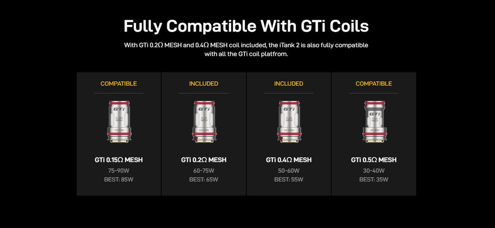 Coil Resistance: GTi 0.2ohm Mesh Coil (60-75W), GTi 0.4ohm Mesh Coil (50-60W)