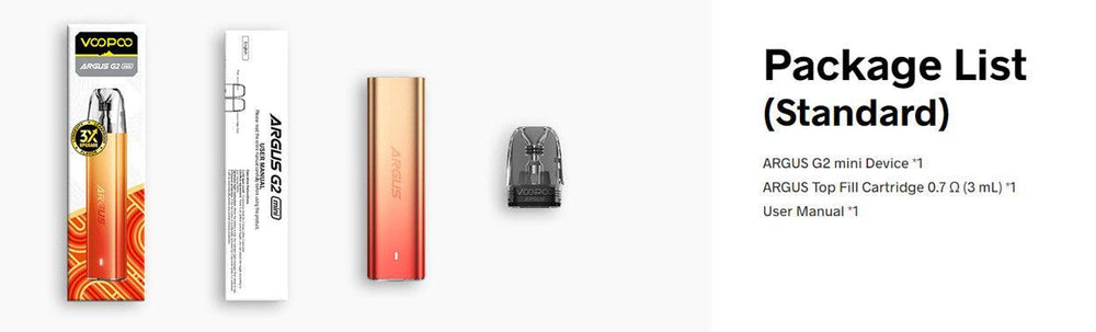 VOOPOO Argus G2 Mini Pod System Kit, an enhanced iteration of the Argus G2 boasting a robust built-in 1200mAh battery with 30W max, a 3ml e-juice capacity, and a convenient side filling system to prevent leakage. Compared to its predecessor, the Argus G2 Mini is more compact and lightweight, perfect for on-the-go vaping. It features LED battery indicator for easy use and precise airflow adjustment to customize your vaping. Packed with upgraded Argus Top Fill Cartridge, it can achieves leakage-free for 30 days of standing, 90ml coil lifespan, and rich taste. It is also compatible with Argus Cartridge Side Fill Version, Argus Empty Cartridge and ITO Coil.