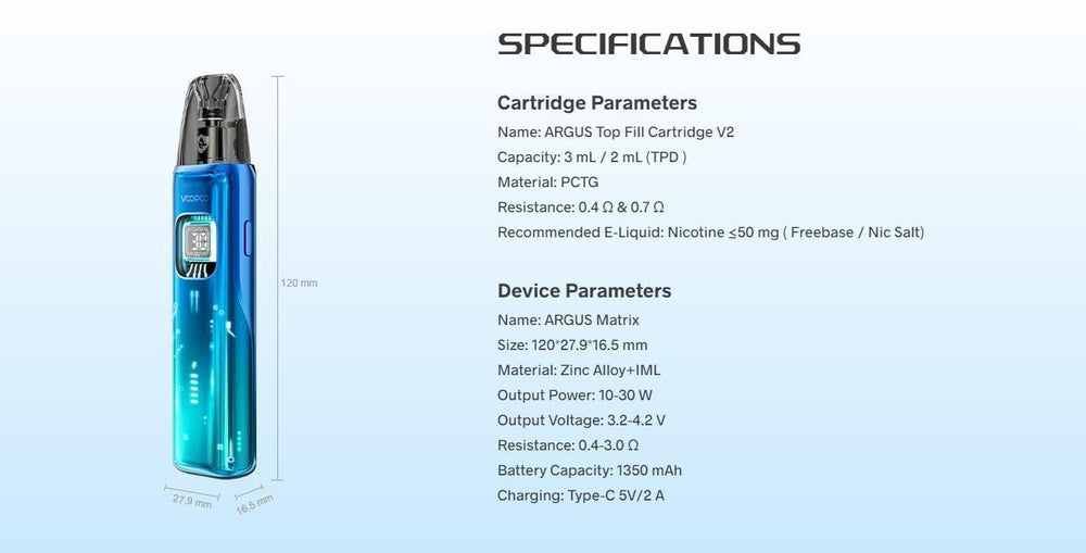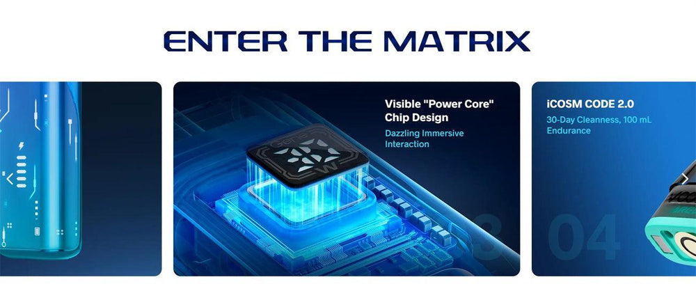Step into the future with the Voopoo ARGUS Matrix Pod System Kit, a stylish and compact pod system featuring a 1350mAh battery, up to 30W output, and a vibrant Curved Full Screen with Dynamic Cyber Visuals. Built with VOOPOO's iCOSM CODE 2.0 flavor technology, the ARGUS Matrix delivers exceptional taste consistency, leak-resistant design, and an extended 100ml endurance vaping experience. Compatible with the ARGUS Top Fill Cartridge V2, it comes preloaded with both 0.4ohm and 0.7ohm mesh coils, ideal for RDL and MTL styles. Ergonomic, visually stunning, and performance-driven, it's the pod system that does it all.