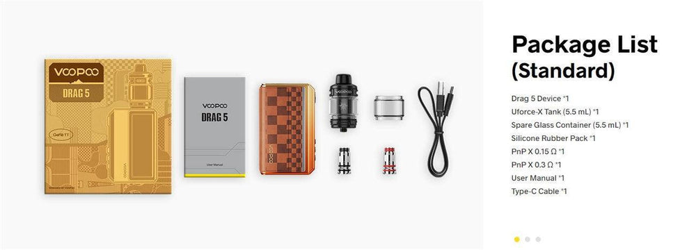 The VOOPOO DRAG 5 Mod Kit is pairing the DRAG 5 Mod with UFORCE-X Tank to provide ultimate Sub-Ohm vaping. Powered by dual 18650 batteries (Sold Separately) housed in the durable zinc alloy chassis, the DRAG 5 Mod adopts the advanced GENE.TT 2.0 chipset to fire up to 177W output. Utilizing the high performance PnP X Series Coils , the UFORCE X Tank features a leakproof top filling and top airflow system to hold up to 5.5ml of your favorite E-juices,A larger TFT color screen is attached to the vape to show all the vaping data you require. 5V / 3A fast charging; the device has plenty of interactions and a variety of vaping modes, as well as the exquisite and fun appearance of the leather.the Drag 5 Kit is perfect for those that love versatility, thanks to the many offerings of the PnP X Coil Series, catering to SMTL or DL vaping.