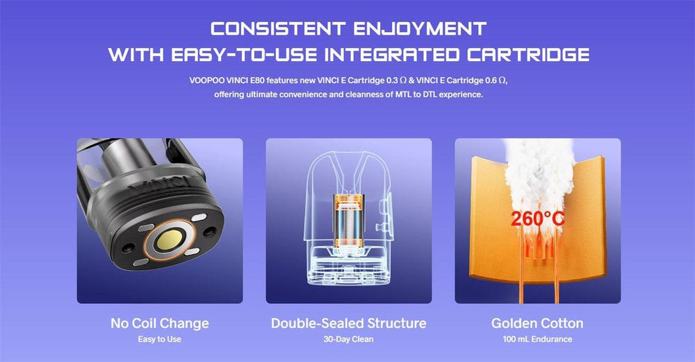The VOOPOO VINCI E80 Pod Kit combines powerful performance with user-friendly design, making it ideal for both beginners and experienced vapers. Featuring a massive 3000mAh built-in battery, the device delivers up to 80W of adjustable power for a customizable DTL to MTL experience. The new VINCI E Cartridge supports 5ml of e-liquid and comes in 0.3 ohm and 0.6 ohm coil options, allowing rich flavor and vapor flexibility. Constructed from durable aluminum alloy and equipped with a vivid 1.47-inch display, the E80 balances functionality with portability. Its top-fill system and compatibility with the PnP X platform ensure a smooth, mess-free refill and wide coil versatility.