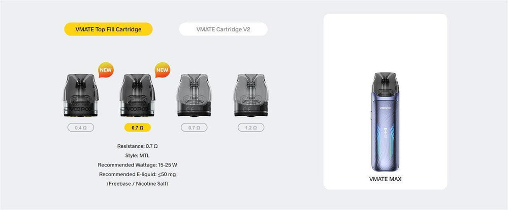 All the VMATE Pod Family devices are currently compatible with VMATE Top Fill Cartridge 0.7ohm. VMATE Top Fill Cartridge 0.4ohm is currently only available for VMATE MAX.