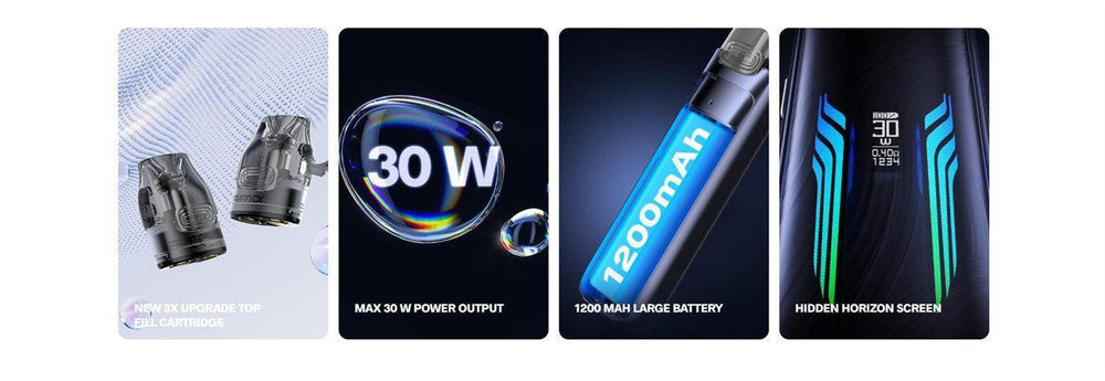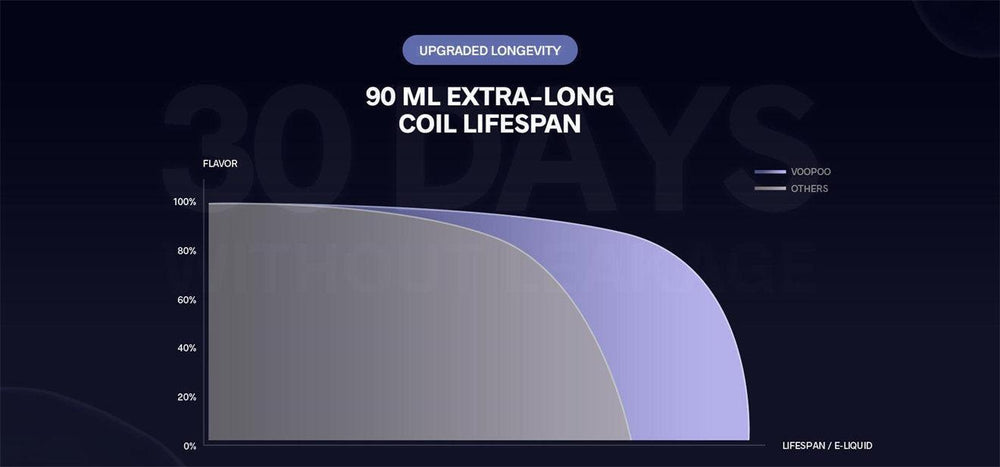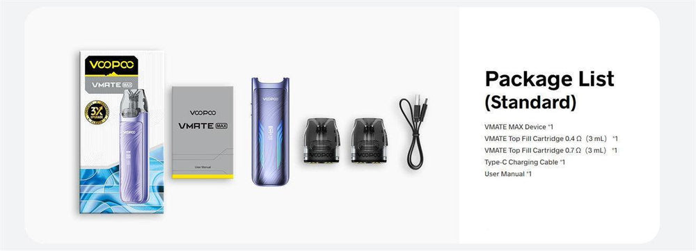 VOOPOO VMATE MAX is a flagship POD with a long 90 mL lifespan and a new hidden horizon screen that incorporates a restrained personality into the aesthetics for a clean and more elegant look. Equipped with the new “3X” Upgrade VMATE Top Fill Cartridge, it is excellent in longevity, leakage prevention and flavor. Combined with the lowest resistance cartridge of 0.4ohm(currently Only Fit Vmate Max Pod) and MAX 30W power output supports Freebase e-liquid, it provides users with dense vapor and smooth RDL relief experience. In addition, the 1200mAh battery supports up to 3 days of vaping, providing a stable and long-lasting vaping experience. With the 5V/2A fast charging, say goodbye to battery anxiety.
